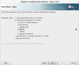 Quando chegar em Operation Type, selecione “Perform an Operation on a Table” e marque as seguintes opções: “Insert or Update (merge)”, “Insert Only” e “Delete”.