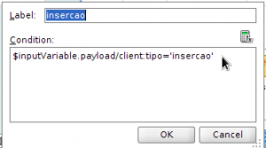 De volta ao BPEL, vamos agora definir os valores na condição do IF, para isso, clique no campo label do IF. Nesse ponto vamos definir a condição que o IF deverá executar, então, clique sobre o ícone  e a tela do Expression Builder será aberta, então, vá até inputVariable > payload > client:process, adicione a variável tipo (ou a que você criou) no campo Expression clicando duas sobre ela, determine qual o valor de execução, no meu caso ‘insercao’ e clique em OK. Veja: