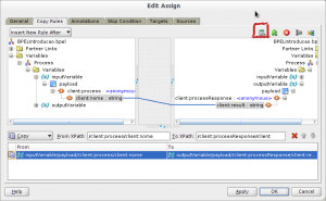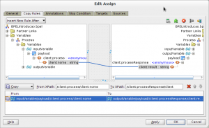Altere a variável input para o nome que desejar, em meu caso, irei substituir por nome. Devolta ao BPEL, vamos agora editar o Assign que inserimos, clique com o botão direito, edit. Na tela em que se abre, no lado direito expanda inputVariable > paylod > client:process > client:nome e do lado esquerdo, outputVariable > payload > client:processResponse > client:result. Faça a ligação entre a variável nome criada e a variável result, conforme apresentado abaixo: