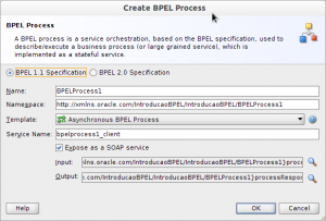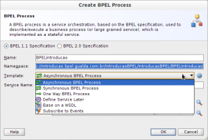 Essa tela é apresentada porque selecionamos a opção de inserir um BPEL no composite. Nela, podemos definir algumas informações, como o nome do BPEL, a url, o template do BPEL e sua especificação. Para o nosso exemplo, irei utilizar a especificaçao 2.0, o nome do BPEL será BPELIntroducao, nosso Namespace http://introducao.bpel.gualda.com.br/IntroducaoBPEL/IntroducaoBPEL/BPELIntroducao (o namespace pode ser matindo de forma original ou alterado conforme sua necessidade). O próximo passo é a definição do nosso template, veja na figura abaixo que temos várias definições, como por exemplo, Asynchronous e Synchronous, onde o primeiro envia uma requisição e não espera resposta para prosseguir, caso contrário ocorre no segundo. Neste nosso exemplo, vamos escolher a opção Synchronous e clicar em OK.