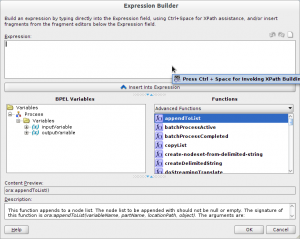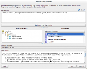 Em Functions, selecione String Functions e dê duplo clique sobre concat para adicionar ao campo Expression na parte superior. Dentro do concat, insira a mensagem que desejar entre aspas simples e coloque uma vírgula logo em seguida. Agora, em BPEL Variables selecione client:nome e dê duplo clique para adicionar após a mensagem inserida.