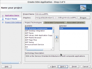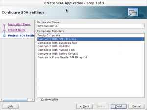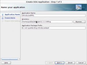 Na tela seguinte você pode definir um nome para o composite, e o template que deseja iniciar. Para o nosso exemplo, selecione a opção Composite With BPEL Process, feito isso, clique em finish.
